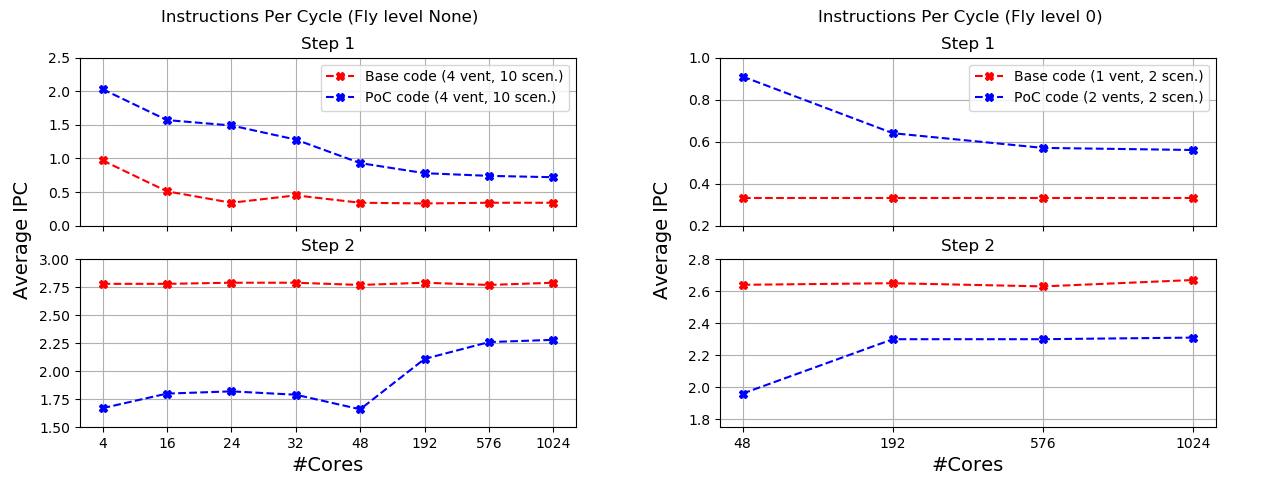 For this use case, parallel efficiency is excellent making the code’s scalability acceptable. However, the very low average IPC leaves room for improvement. Both configurations show slow sequential code and Python’s runtime takes a large number of instructions for solving the problem.