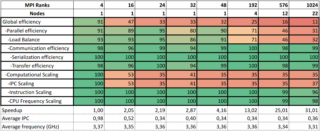 From the numbers, we can conclude that load balance and IPC degradation prevent the application from scaling with processes. We found that the load balance problems are caused by a sequential region not parallelized with MPI. The IPC problems were caused by bad code and memory congestions.