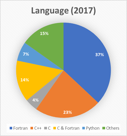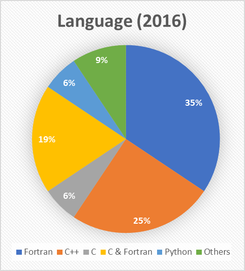 9 months ago, the predominant language that the assessed codes were written in was Fortran. Today, this is unchanged – in fact, the breakdown across the board is almost identical, down to the actual percentages of each language observed.