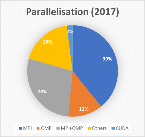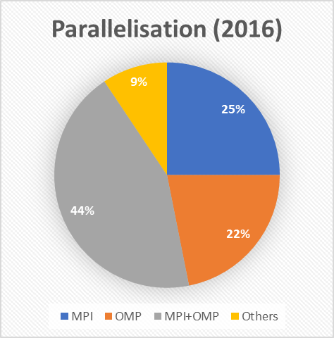 What has changed is the distribution of the ways in which the codes are parallelised. In the earlier review, we saw that nearly half (44%) of the codes that POP had looked at used a hybrid approach that combined MPI and OpenMP. Today hybrid codes only make up 28% of all those analysed, and the most common form of parallelisation is MPI by itself.