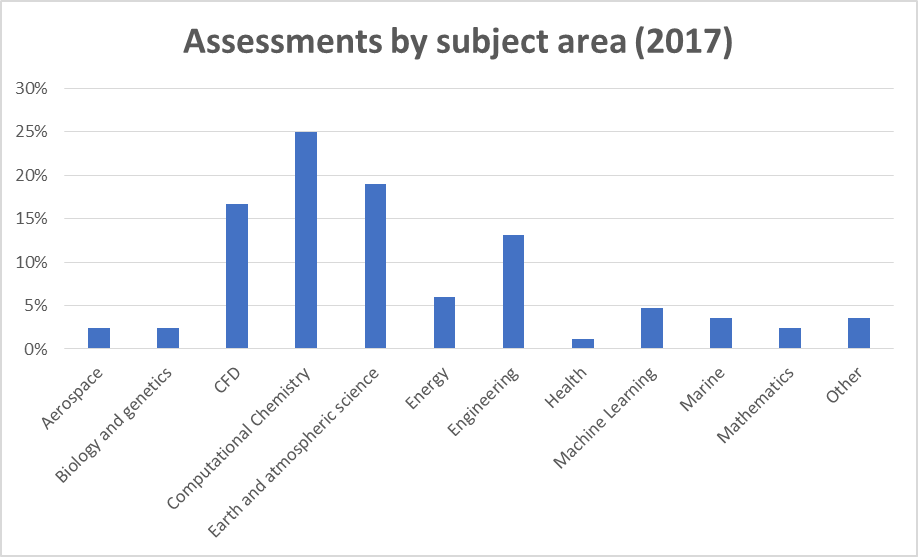 Given the extra categories compared with 2016, it is clearer to plot the 2017 data as a bar chart. “Computational Chemistry” codes make up 25% of our assessments, which is in-line with the combined 26% for “Physics” and “Chemistry” codes in 2016. Engineering has shown a slight drop over the same period (from 37% to 30%, if “CFD” and “Engineering” are combined), but this has been balanced by a growth in assessments from other areas not represented in 2016, such as “Energy” and “Machine Learning”. POP has successfully broadened its appeal to wider audiences beyond traditional HPC users.