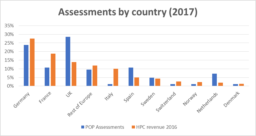 As we noted in the earlier review, this may be because 3 of the POP partners are based in Germany and NAG, which leads the business development efforts, is based in the UK. To judge how much this is a factor, we compare the percentage of POP assessments against the size of the HPC market in every European country.[1] We see that Germany is the largest HPC market on the continent, which explains why it has such a large share of POP assessments, and that the UK is somewhat over-represented, which we attribute to the presence of NAG. We also see that Spain is also over-represented, which may not be surprising as the coordinators of the POP project are based in Barcelona. The popularity of POP in the Netherlands is largely because we have one customer there who has submitted several codes for assessment (see the success stories from SCM on our website https://pop-coe.eu/target-customers/success-stories).