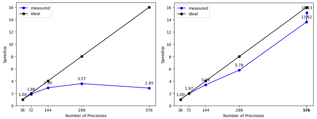 Fig. 2: Scalability of the original (left) and updated (right) version of the code.