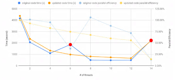 Fig 2. The original code shows much better execution time and parallel efficiency compared to the updated code because the data race made the application perform less number of iterations than it is supposed to do.