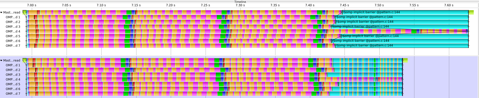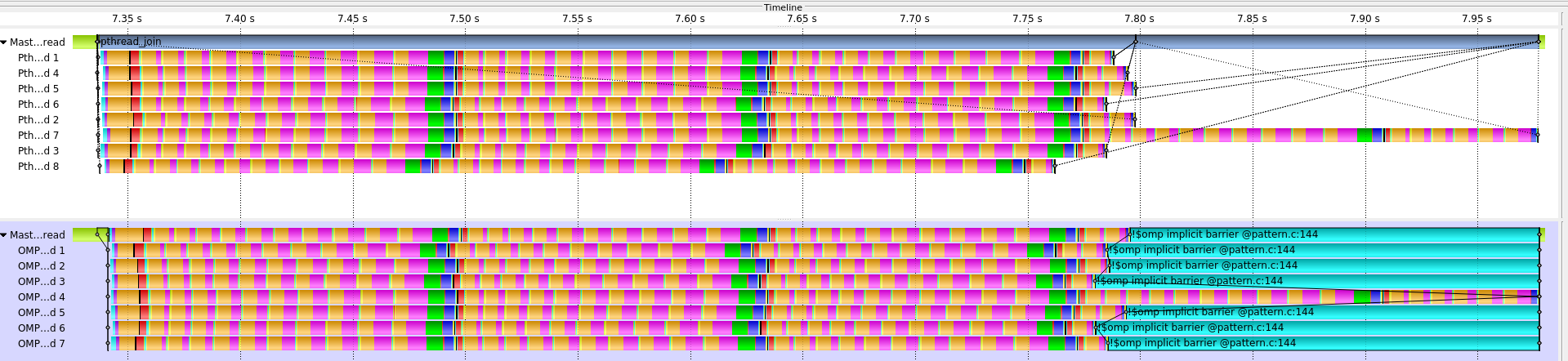 Fig 4. Score-P trace comparison of the CalculiX-solver kernel pthread version (top) and the OpenMP version (bottom)