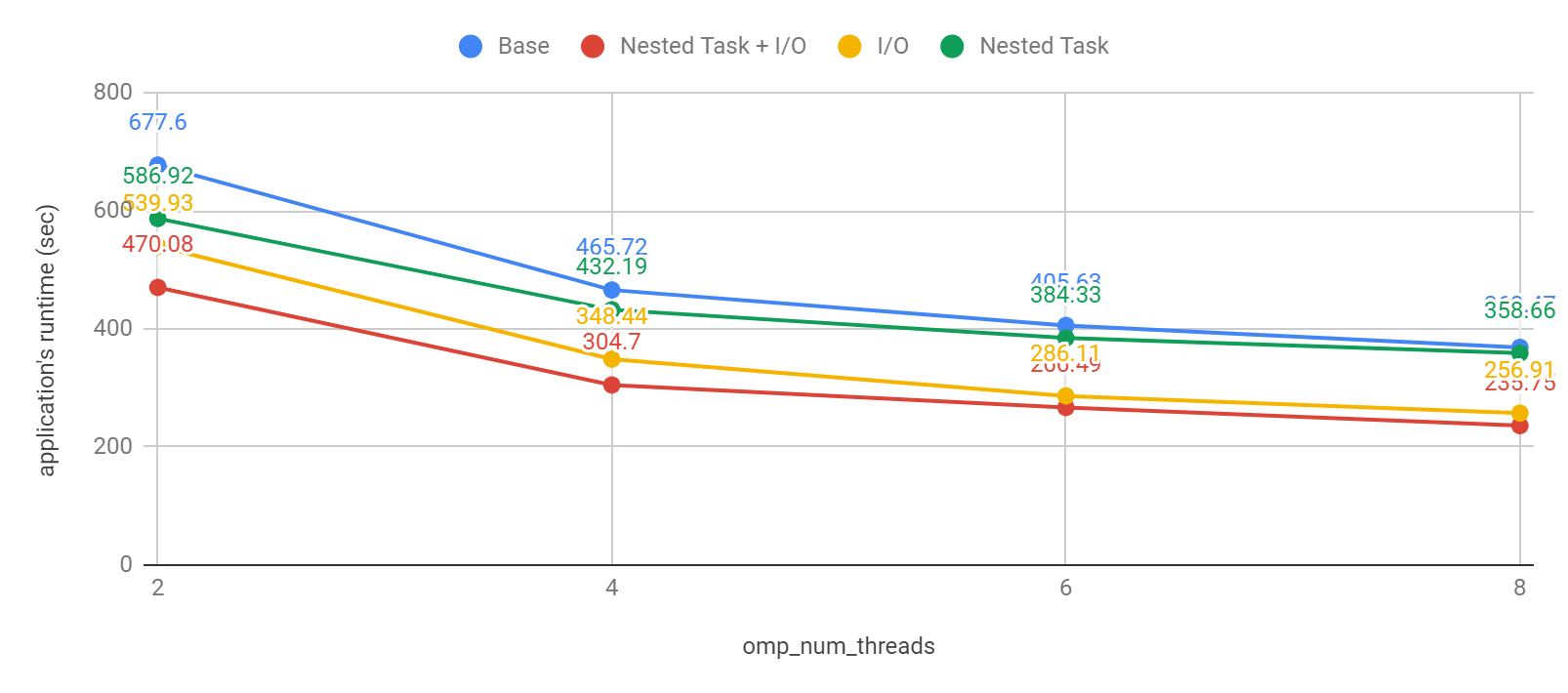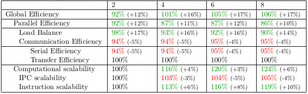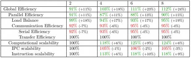 Combining the buffered I/O and nested task loop solution together, the overall performance improvement is even higher where we can get up to 24% improvement in the global efficiency as we can see from the POP metrics table below.