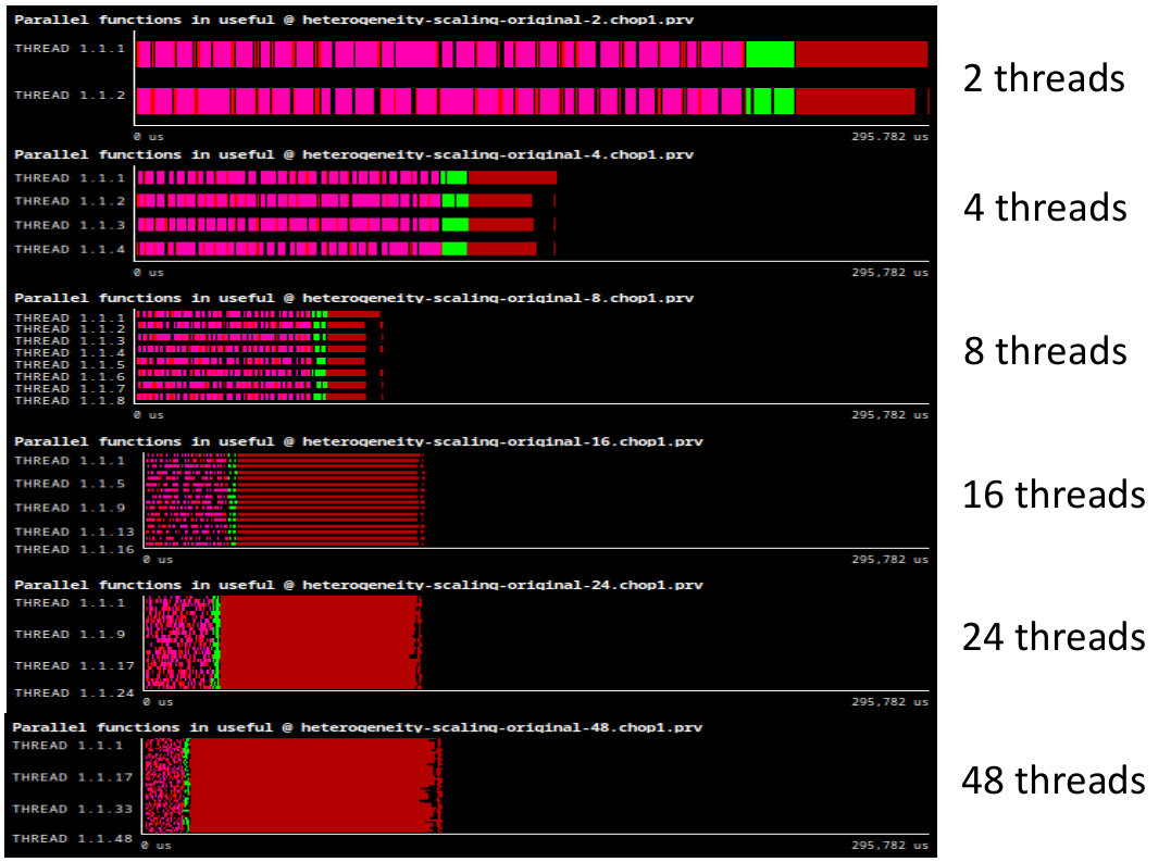 Following the POP methodology and using the BSC tools (Extrae, Paraver, and BasicAnalysis suite) we studied the performance and scalability of the application, trying to identify the main factors limiting scalability. In our first execution of the application, we rapidly observed which parallel region has the major impact in the execution time. Figure 1 depicts a series of Paraver traces corresponding to executions from 2 to 48 threads, all at the same time scale. The big dark red region at the far right , which corresponds to the 4th task in the iteration as described before, takes most of the time and does not scale correctly.
