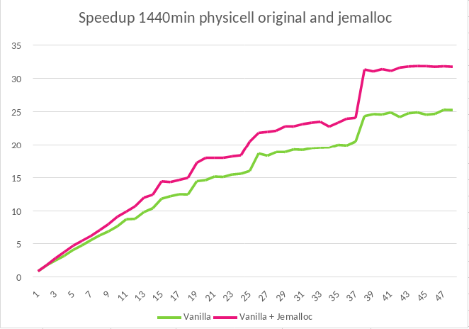 This high numbers of memory allocations present a bottleneck when process scales to more than 8 threads, as the management of dynamic memory usually needs synchronization points. To solve this problem, we integrated a new library capable of handling memory allocations with concurrency in an efficient manner. Jemalloc is "a general purpose malloc(3) implementation that emphasizes fragmentation avoidance and scalable concurrency support"[2]. It can be integrated easily to any code by preloading the library, with LD_PRELOAD in Linux for example. After applying this solution to PhysiCell, we executed the same experiment and analyzed it with the same tools described before and found that we reduced the original run time by 31% for the case of 48 threads, or 27% reduction of the run time when using 24 threads. We also saw that the strong scalability is improved, going from a speedup of 25.4x (original malloc version) to 31.9x (Jemalloc version) for 48 threads (Figure 4).