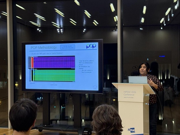 During the session "Rethinking scientific applications for exascale and emerging architectures: the Centre of Excellence challenge", Sandra Mendez (BSC) presented the application of the POP methodology for the performance analysis of hybrid parallel applications on behalf of the POP3 Centre of Excellence. The presentation focused on how structured performance analysis can provide a precise understanding of application and system behaviour, enabling meaningful and actionable assessments to be carried out. The POP methodology was presented as a systematic workflow involving the identification of application structures, the selection of areas for analysis and the evaluation of hierarchical efficiency metrics.