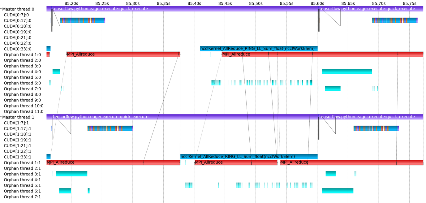 A recent POP performance analysis measured parallel performance of a TensorFlow ResNet-50 network running on 48 and 64 Nvidia Tesla V100 GPUs, where Horovod with OpenMPI was used for inter-process communication. The Score-P tool was used to collect trace data, which was then analysed in Vampir. This showed good load balance of computation over the GPUs, but low GPU Parallel Efficiency, which reduced further on 64 GPUs. In both cases, the GPUs were idle for more than two thirds of the training. The assessment recommended reducing GPU idle time by adding workers to the image generator to supply pre-processed batched data to the GPU.