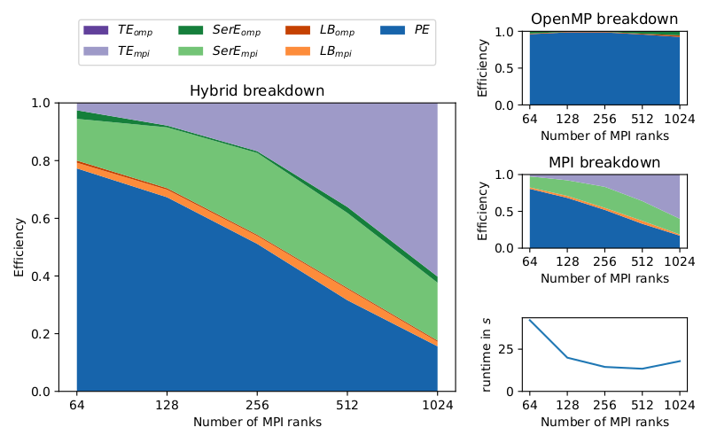 OTF-CPT is a lightweight performance analysis tool that reports a summary of POP metrics for MPI+OpenMP at the end of execution. Based on on-the-fly critical path analysis, the tool collects all metrics necessary to report a breakdown of POP metrics for MPI and OpenMP (see below). The tool can also be used for MPI parallel or OpenMP parallel applications.