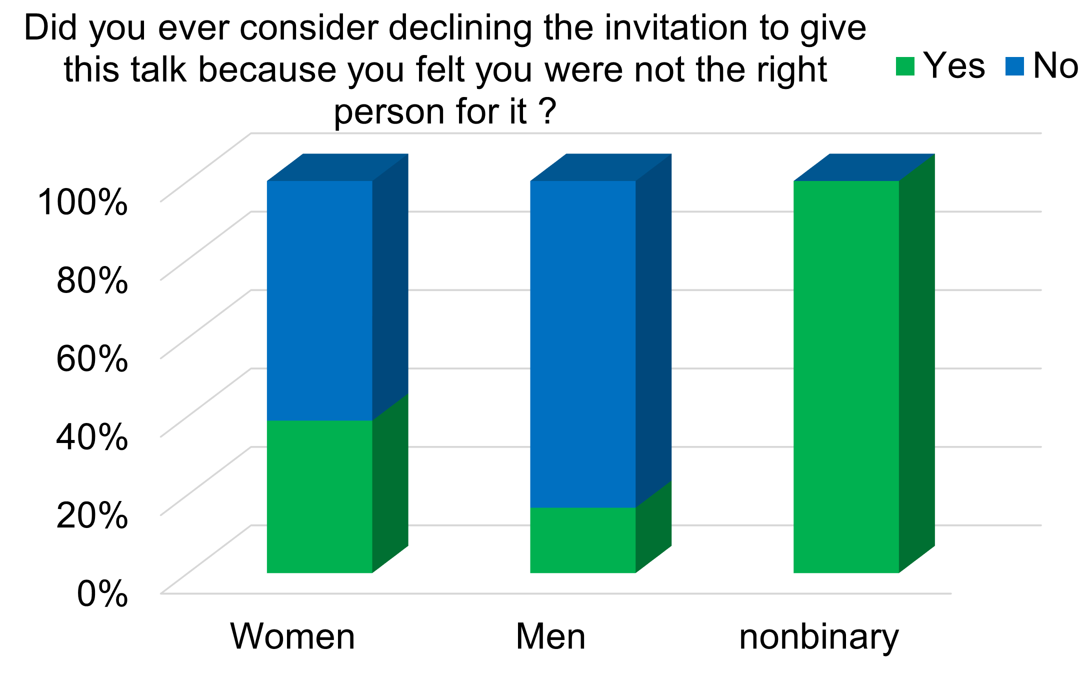 Fig 5: Response by gender to the question: Did you ever consider declining the invitation to give this talk because you felt you were not the right person for it?”