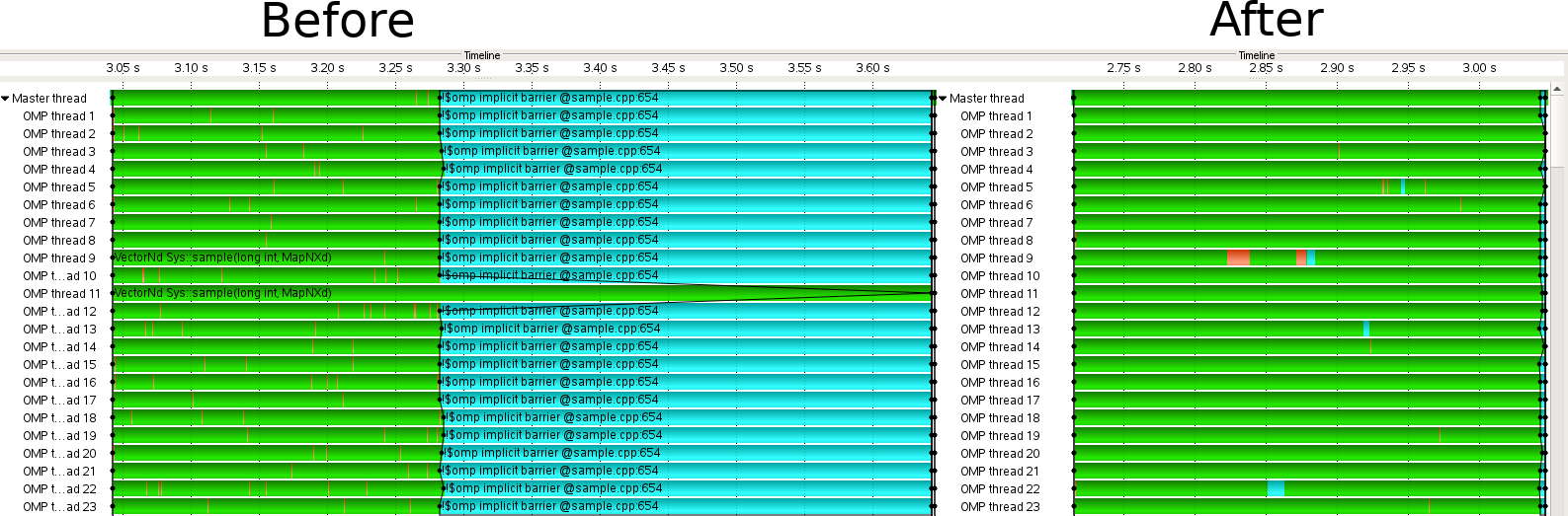 The POP experts now implemented a second nesting level and made also use of OpenMP tasks, which solved the load balance problem: Originally the load balance of the problematic code part was 42.5% – after the modifications 98,9%.
