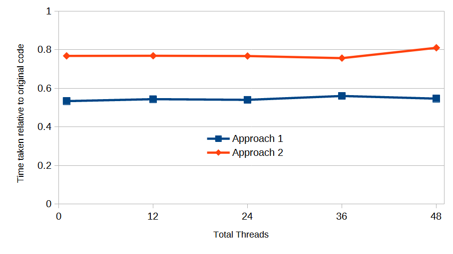 As shown in Figure 2, Approach 1 was almost twice as fast as the original code whereas Approach 2 gave an approximately 1.3x speedup. Vector capacity usage for both approaches was over 99%. However, in order to get Approach 1 to work, the compiler directive !$OMP SIMD REDUCTION had to be used with the reduction on an array. This is a fairly recent addition to the OpenMP standard so makes the code less portable. Approach 2 only requires access to a good BLAS implementation for DGEMM and ZGEMM calls.