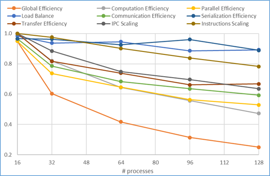 Both these efficiencies are broken down further. For example, low computation efficiency could be due to requiring more instructions as you run on more cores, or maybe throughput has slowed caused by reduced IPC (instructions per cycle) or reduced CPU frequency. Parallelisation efficiency is also broken down further, e.g. a load balance component, serialisation efficiency and communication efficiency. And all these efficiencies can be analysed further.