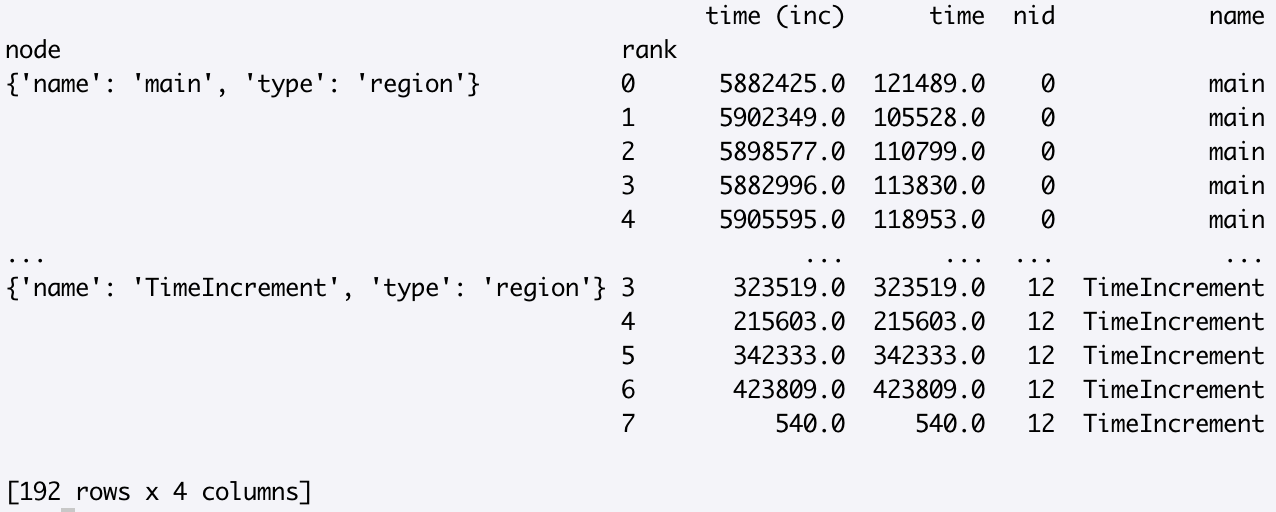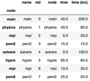 Profiling tools such as HPCToolkit, Caliper, TAU, and Score-P allow developers to focus their optimization efforts by pinpointing the parts within a code's execution that consume the most time. Most profiling tools use their own unique format to store recorded data, and they may display this data as text or with a tool-specific viewer (typically a GUI). The analysis capabilities in these tools are limited in the kinds of analyses they support, and they do not enable the end user to programmatically analyze performance data.