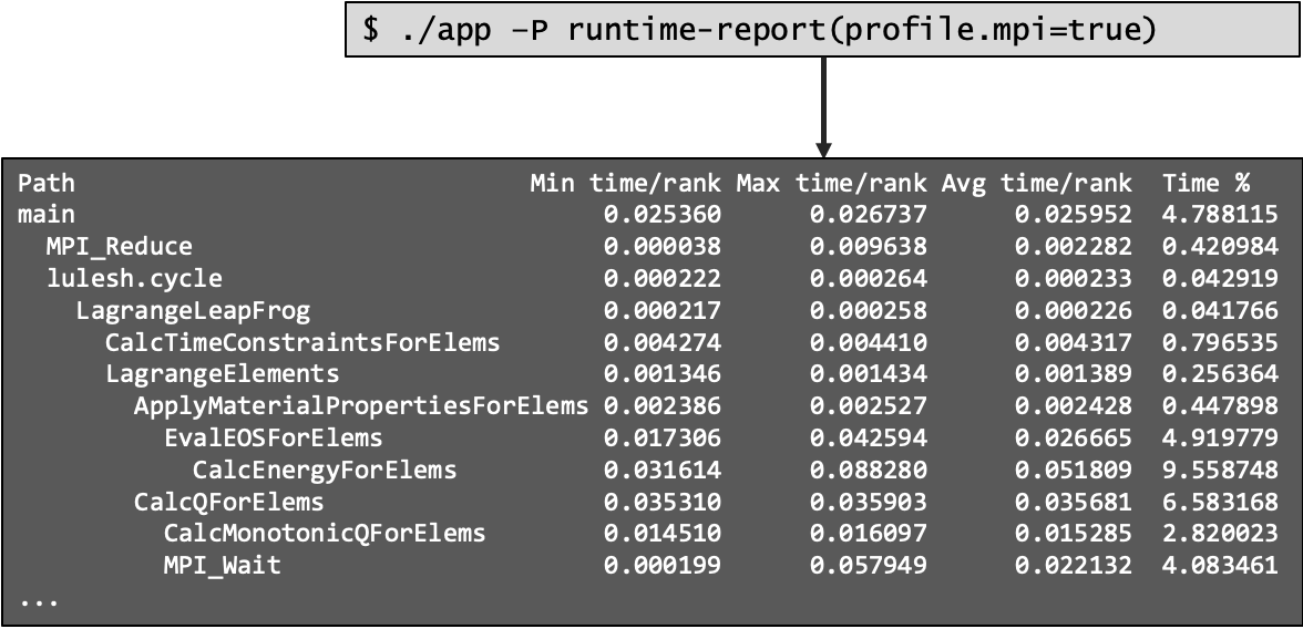 Caliper is a performance analysis toolbox in a library. Unlike many traditional performance analysis tools that focus on interactive in-depth performance debugging, Caliper directly integrates performance profiling capabilities into HPC applications, making them available on-demand for any application run. This approach greatly simplifies performance profiling tasks for application end users, who can enable performance measurements for regular program runs without the complex setup steps often required by specialized performance debugging tools. With Caliper, users control performance profiling through application-defined inputs, like a command-line argument. In the example below, the -P runtime-report command-line argument prints a time profile at the end of the program run: