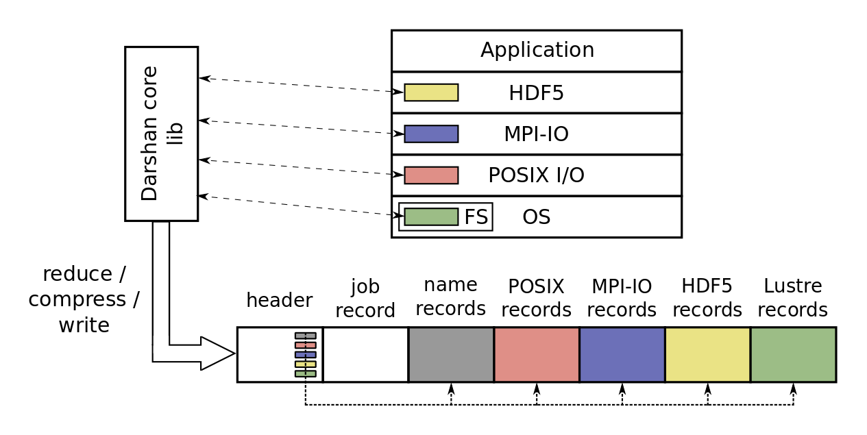 Understanding the I/O behavior of HPC applications is critical to ensuring their efficient use of storage system resources. However, this is a challenging task given the growing depth and complexity of the I/O stack on these systems, where multiple software layers often coordinate to produce optimized I/O workloads for the underlying storage hardware. Darshan is a lightweight I/O characterization tool that helps users navigate this complex landscape by producing condensed summaries[1] of an application’s I/O behavior, including total I/O operation counts, histograms of file access sizes, and cumulative timers, among other statistics. Darshan utilizes a modular runtime architecture, as shown in Figure 1, allowing it to capture data from distinct components of the I/O stack (like I/O libraries and file system interfaces) and to integrate this data into a single log file encapsulating all instrumented I/O data for an application.