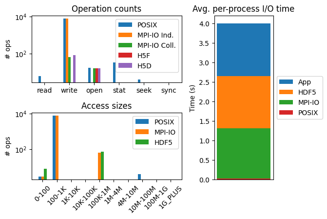 Figure 2 - Total operation counts (left-top), access size histograms (left-bottom) and average per-process timing information for HDF5, MPI-IO, and POSIX I/O interfaces using a simple MACSio benchmark execution. Note the figures on the left use log-scale on the y-axis.
