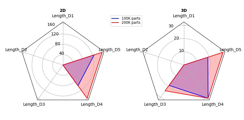 Figure 3 uses radar plots to help illustrate the HDF5 dataset access characteristics of example MACSio benchmark executions using 2D and 3D meshes and different numbers of parts. These plots are helpful for visualizing the length of hyperslab access along various dimensions, which could have a critical impact on I/O performance depending on chunking parameters used to partition datasets. Similar plots could be generated for stride of hyperslab accesses, which is similarly important.