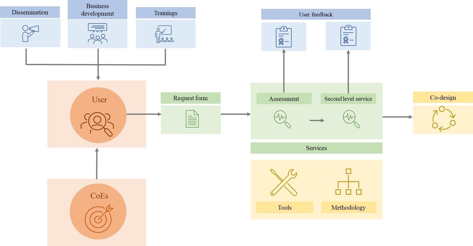 The user pillar consists of the work areas dissemination, user training, customer development and customer satisfaction.